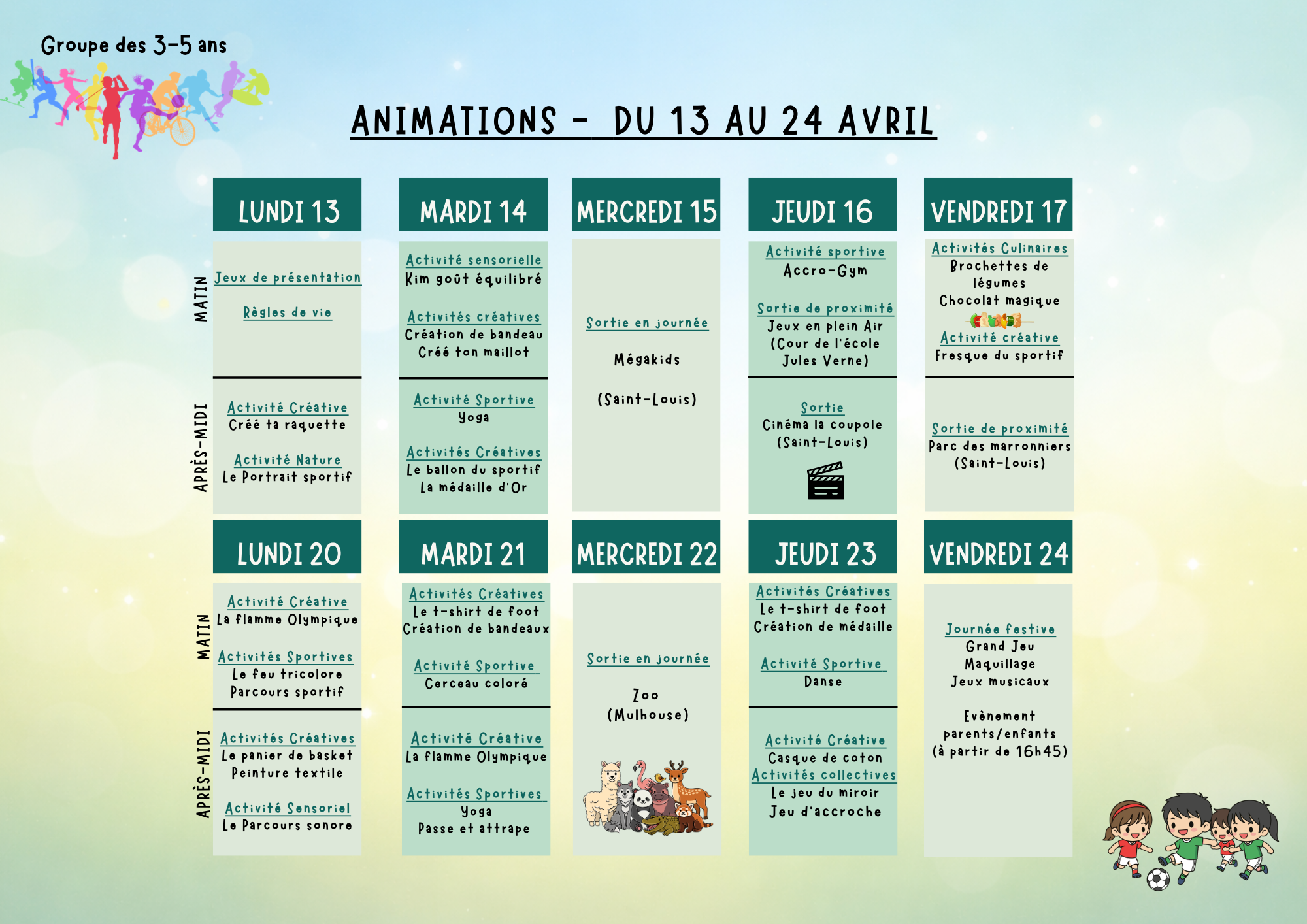 Le Centre Socio-Culturel de Saint-Louis propose un accueil de loisirs pendant les vacances scolaires, destiné aux enfants âgés de 3 à 12 ans.